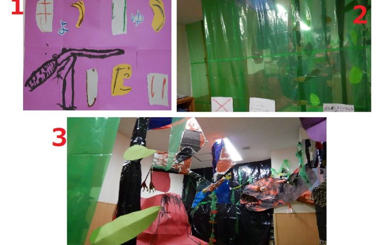 あさひ組(5歳児クラス)の発案後、幼児クラスみんなで作り上げてきた恐竜時代展が本日オープンします!今日観覧するのはまめ組(0歳児クラス)・よつば組(2歳児クラス)です。朝からあさひ組の子どもたちに「まだ入っちゃだめ~」と言われていたので、こっそりオープン前に偵察・・・(*^_^*) 写真1は手作り看板!ワイルドです♪ 写真2は部屋の中…天井から緑の幕がかかっていて中が見えません 。写真3で幕の中をのぞき見。。。天井まで届きそうな恐竜や空を飛んでいる恐竜が見えました! オープンまであと少し!みんなワクワクしています!