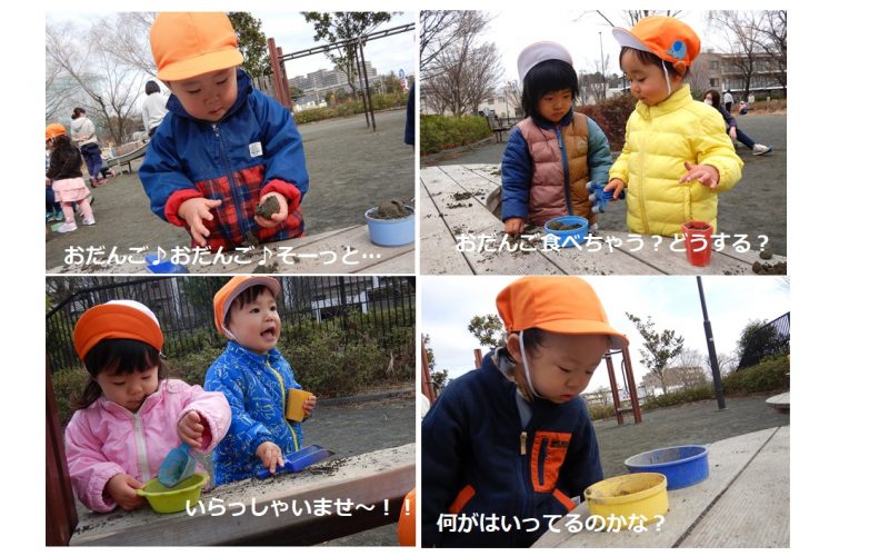 朝晩は冷え込みますが、昼間のお日様はポカポカ!今日もまめ組、ふたば組の子どもたちはのびのびと好奇心旺盛に遊んでいました。おだんごはそーっと持たないと崩れてしまうことも体験!砂遊びはいろんな感覚を養えます。