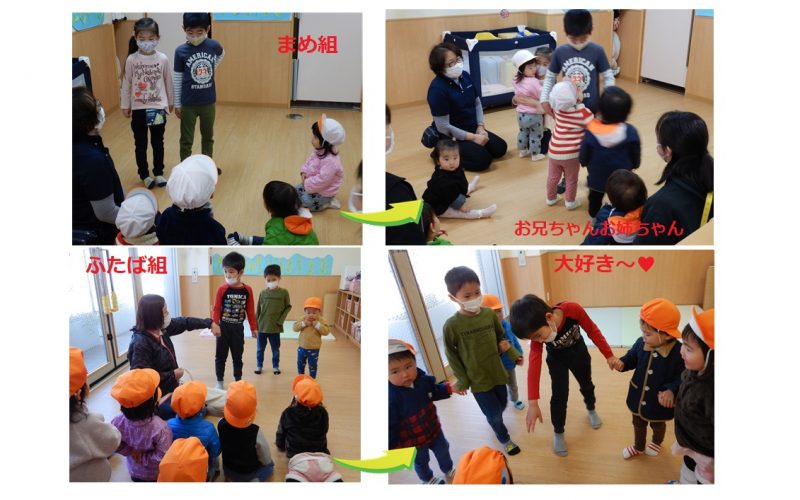 昨日卒園式を迎えたあさひ組は保育園生活もあと半月・・・。嬉しいことですがさみしい気持ちもひとしおです。あさひ組はほかのクラスのお友だちともまだまだ楽しい思い出を作ろう!ということでクラスの交流会の時間を持ち、思いっ切り遊ぶことにしました。何をして遊ぶかはそれぞれのクラスのお友だちのリクエストにあさひ組が応えます♪あさひ組代表者がまめ(0歳児)・ふたば(1歳児)組に交流会を伝えに行きました。「公園で一緒に遊びたい」「手をつないで歩いて欲しい」それぞれのリクエストを聞いている時にもお兄ちゃん、お姉ちゃんは大人気♥すぐに小さなお友だちに囲まれていました。