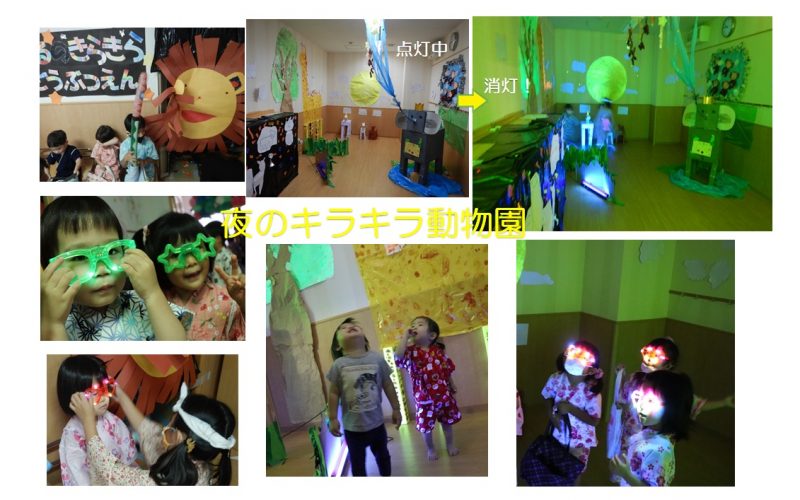 あさひ組(5歳児)企画・制作の夜のキラキラ動物園も大好評!子どもたちの目もキラキラ!・・・光るサングラスをかけて中に入るのです(^-^) 室内は消灯。ブラックライトで月や動物が光ります!
