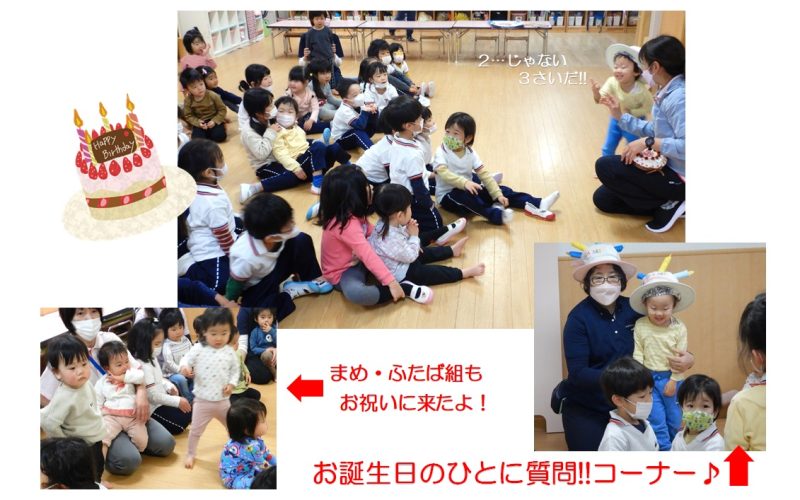 幼児ルームでは、月に1回みんなでお誕生会をしますが、お誕生日を迎えた子のその当日もそれぞれお祝いします。カスタッチは明日から年末年始休みです。土日や祝日などお休みにお誕生日を迎える子どもたち・・・大丈夫!ちゃんと休み明けなどのタイミングでお祝いします(^_-)-☆1年に一度、自分だけの特別に嬉しい日ですものね♪ママにとっても、誕生日は出産した特別な記念日!その子に出会えた記念日!ご家族の皆さんの特別な日、心を込めてお祝いしたいです!今日お祝いされたのは年末連休中にお誕生日を迎えるお友だち!おめでとう~!!それから・・・今日は、いつも子どもたちやパパやママのあったかい味方、また、職員にとっても母のように心強い仲間!みんなの大好きな園長先生のお誕生日でもあります!2021年もあと少し・・・皆様、楽しい年末年始を★良いお年をお迎えください。来年もよろしくお願いいたします。