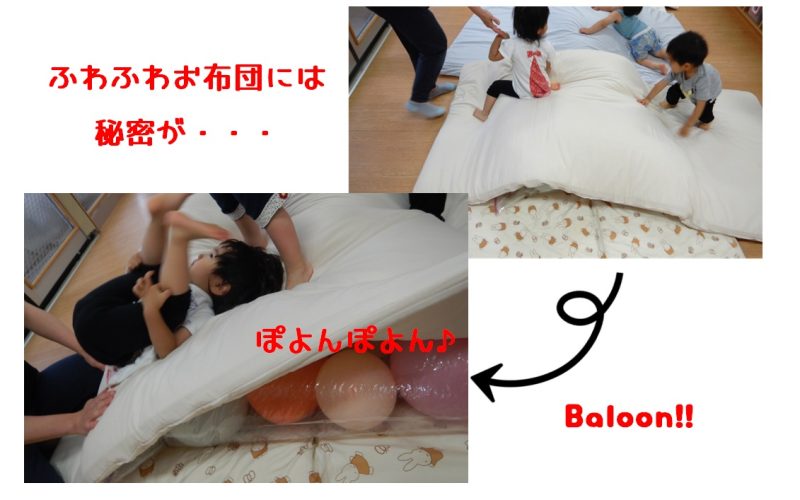 猛暑が続きますね! 外には出られないので、各クラス、シャワーやプール、水を使った遊びなどを活動に組み込んで過ごしています。写真はお水で遊んだ後のふたば組(1歳児クラス)、ぽよんぽよんのお布団で気持ちよさそう~♪