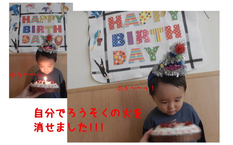 お誕生日のお祝いをしていた乳児クラス!ろうそくの火、これを消すのはなかなか難しい!教えるのも難しい(^^;)「ふぅ~」っと言葉で息を吹きだすのをやってみると、「ふぅ~」と言葉だけになってしまったり(それもかわいいんです~♥)、なかなか狙ったところに息を吹けなかったり。。。今日は1歳児クラス、自分でろうそくを消せたのが初のことで、拍手喝采でした(^-^)