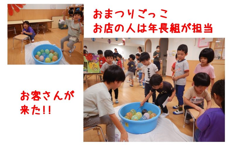 昨日の夏祭りの余韻を今日も楽しもう!!!幼児クラスでは「おまつりごっこ」をやりました。昨日と違うのは、今日はお店の人を年長組が担当するんです。ゲームをやるのも楽しいけれど、お店の人もやってみたかった~☆という意欲を発揮していましたよ!お客さんを呼びこんだり、ゲームのやり方を説明したり、ゲームを仕切ったり! すごいのは…お客さんの年齢に合わせて自主的に対応を変えていたんです!ヨーヨーは釣りやすいように手で輪っかの部分を押さえていてあげたり、ワニワニゲームではスピードを変えたり・・・!やってもらって嬉しかったこと、楽しかったことを年下のお友だちにもやってあげる、このループがお祭りでも自然に引き継がれている姿を嬉しく思います(^-^)