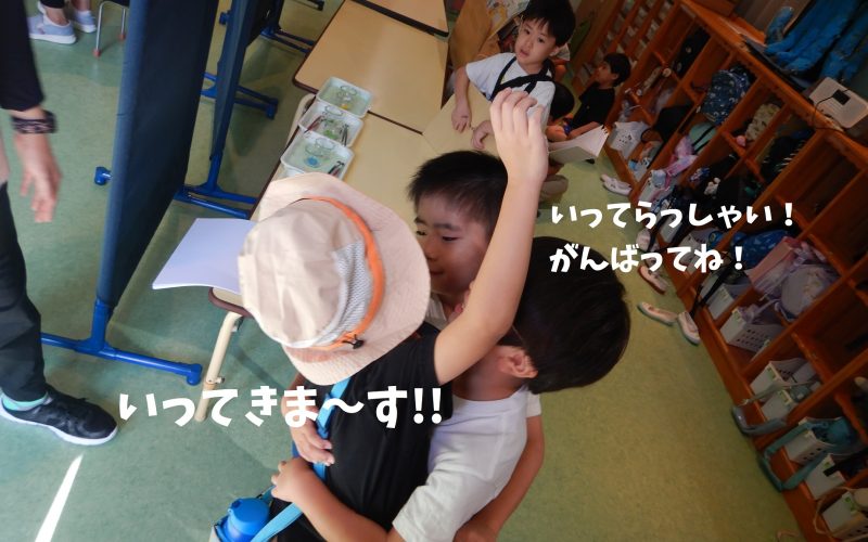 おとうばん先生(年長組がひとりで他のクラスに赴き、いっしょに遊んだり、絵本を読んであげたり、制作を教えてあげたり・・・と、小さいクラスの中でリードをとってくれます!)の日!おとうばん先生の担当の子は、今日を楽しみに、ちょっとドキドキ緊張してむかえます。そんな、ドキドキを勇気に変えてくれるのは、友だちの応援!今日も、おとうばん先生に行く子に応援のハグで見送ります!!!