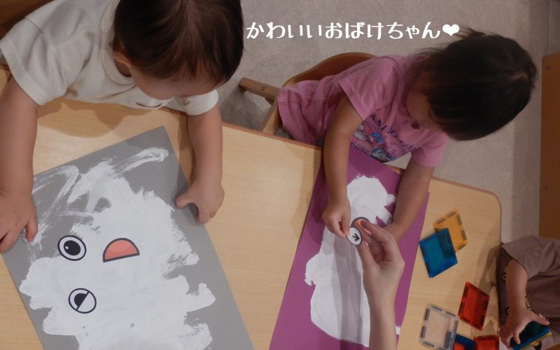 各クラス ハロウィンに向けてダンスや制作を楽しんでいます。今日は1歳児クラスがおばけちゃんの顔を作っていました♫ 子どもたちはハロウィンが大好き!おばけ~というキャラクターに親しみがあるのでしょうね!新しいダンスも大盛り上がりです★ 1歳児クラスの制作おばけちゃんは…かわいい!! 今しかできない作品👻これは大人が作為的に作ってもこうはかわいくならないでしょう(^-^)