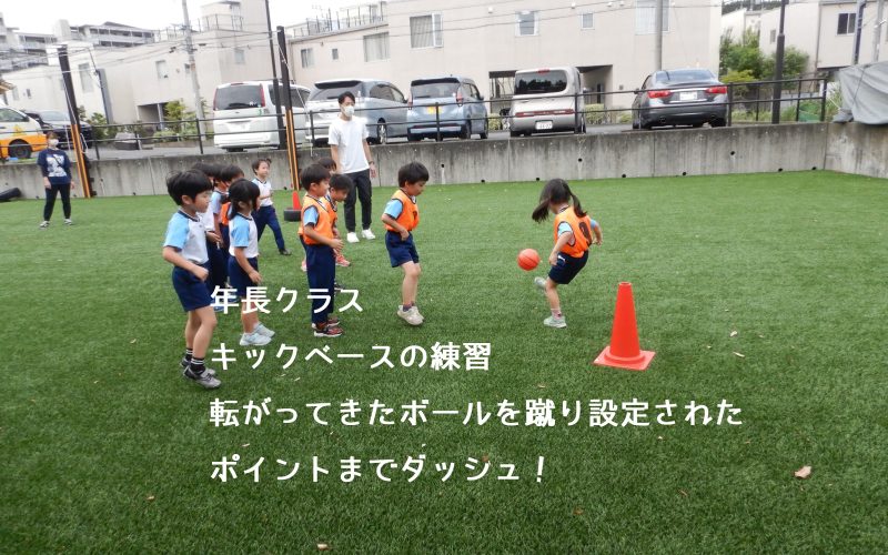 年長組のリンク。ルールや動作もだんだんと複雑になってきています。今日はキックベースの初歩的な練習。転がってきたボールを蹴り、設定されたポイントまでダッシュしてベースに戻ってくる、ボールを拾った人は蹴った人がベースに戻ってくるまでにボールを持ってベースへ!!! 転がってきたボールと自分との距離、蹴るタイミング、どこに蹴るか?蹴った後素早く動く。。。いろいろな運動要素が詰まっています。最初はひとつひとつの動作で止まってしまったり、考えて思い切り走る、蹴るができなかったりしましたが、慣れてくると友だちと声をかけあいだんだんと動けるようになっていました!
