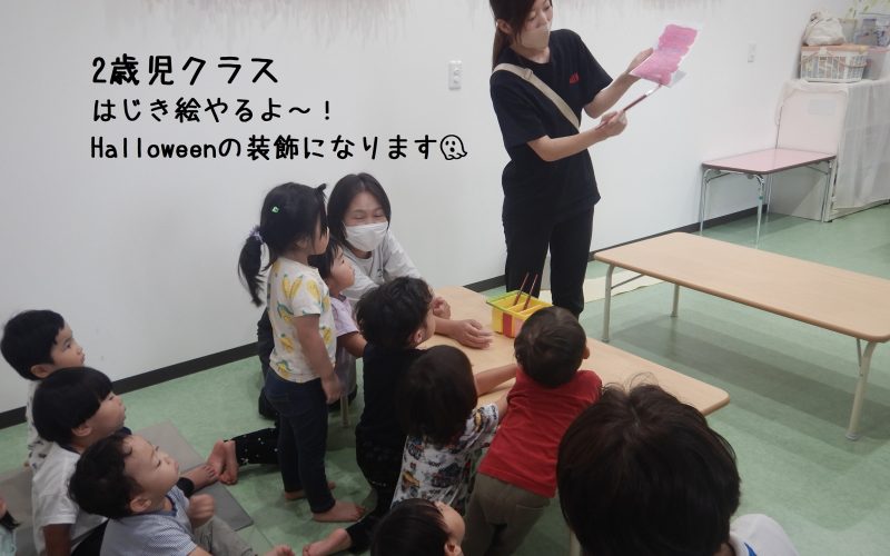 2歳児クラス はじき絵をしました♫事前にクレヨンで描き描き…絵の具を筆で塗るのを楽しみにしていた子どもたち♪このはじき絵は、このあとおばけに変身するそうです👻