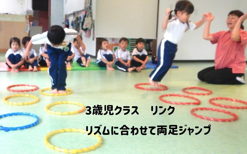 3歳児クラスのリンク☆彡今日はリズムに合わせてジャンプに挑戦です。決められたタイミングに合わせてジャンプできるよう、自分の身体の動きを合わせます。両足ジャンプで最後のフープでリズムよく進んでみよう(^^)/