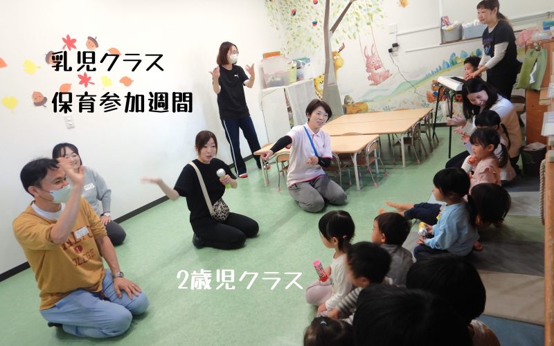 先月は幼児クラスは保育参観を行いましたが、今月は乳児クラス!乳児クラスは保育参観ではなく保育参加なんです♪ 子どもたちの姿を見てもらいながら、子どもたちと触れあって一緒にたくさん遊びましょう!という参加型の保育参観なのです。日毎に数人ずつ参加してもらいます。2歳児クラスは、パパママ先生になって一緒に遊んだり、絵本を読んだり、制作を手伝ったり…と大活躍でした。1歳児クラスでも子どもたちが大好きな歌遊びや絵本を一緒に楽しんだりしながら子どもたちの成長を近い距離で見て感じていただきました★ これから参加される保護者の皆様も楽しみにしていてくださいね(^_-)-☆