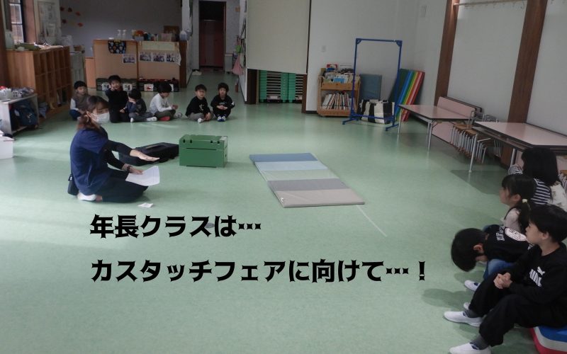 乳児クラスは昨日に引き続き保育参加で、保護者の方々の楽しそうな声が聞こえてきました。3・4歳児クラスは遠足でお弁当を持って公園まで出かけています。年長組は…お部屋を全部使ってカスタッチフェア~表現~に取り組んでいました。年長組の子どもたちはセリフの他にも進行役のナレーションなどあります。幼児クラス全体をリードしてくれる最年長組、頑張っていますよ~~★