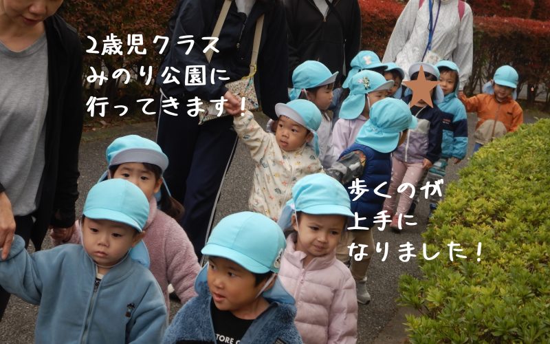 2歳児クラス 片道20分の公園まで歩いて行ってきます!手をつないで歩くのも上手になりました。この季節、葉っぱや木の実など、歩きながらの発見もたくさん(^-^) 公園では何を見つけられるかな?