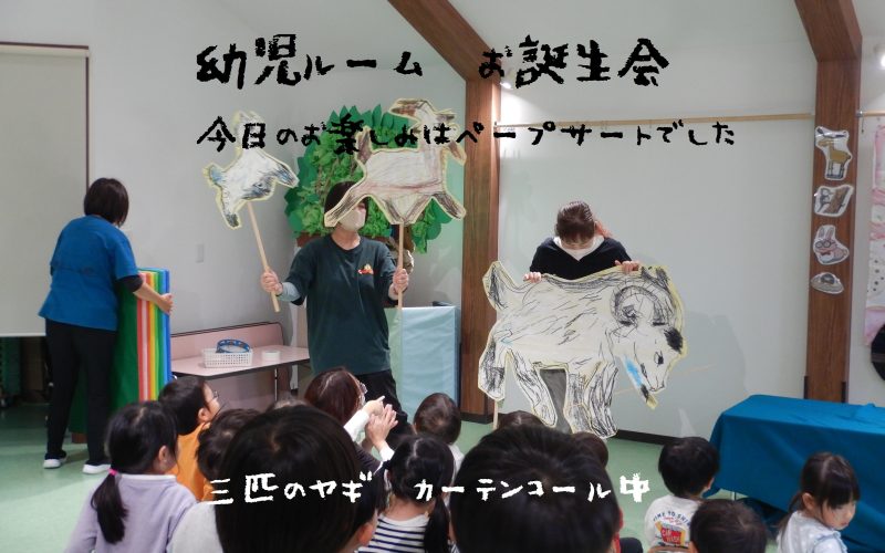 今日のお誕生会 先生たちからのお楽しみプレゼントは大型ペープサート!「三びきのやぎのがらがらどん」このペープサートはもう卒園してしまいましたが、子どもたちが作ったものなんです。その子たちは今6年生です。今でもカスタッチの子どもたちを楽しませてくれています。(当時は発表会で子どもたちが紙人形を操作してセリフを言っていました)