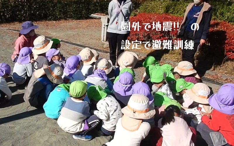 各クラス、園外で地震発生 の想定で避難訓練を行いました。幼児クラスは公園で遊んでいるときに地震!!! 地震はいつ起こるか分かりません。靴を履いているときかもしれないし、道を歩いているときかもしれない・・・いろいろな場合を想定し、いざというときに備えて、連絡手順や安全なルートなどを確認しあっています。 地震が起こったらすぐにそばにいる先生のそばに集まりましょう、頭を守ります、おしゃべりはしません、、、毎月の訓練の成果もあり、子どもたちは素早く集まることができました。毎月の訓練の積み重ねの大切さをあらためて感じました。