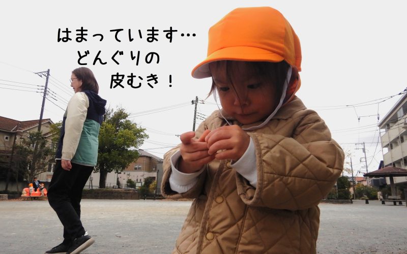1歳児クラス、お散歩準備はやる気十分!ジャンパーのファスナーを自分で締めようとしたり、靴を履いたり、、、このあとのお楽しみ、公園に行くとなったら、とっても意欲的(^-^) では出発!横断歩道ではバギーに乗りながら手をあげているし、公園の入り口の階段は全員が歩いて登り切りました★そして、どんぐりを見つけると、きれいに皮をはがしちゃうんです。いろんなことをいっぱい吸収して、子どもたちは急成長真最中~~!!