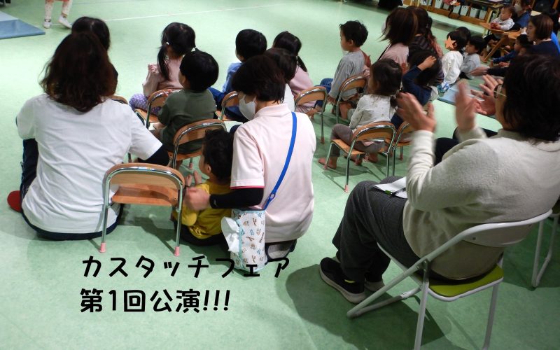 いよいよ週末に迫ってきました、カスタッチフェア~表現~ 今年度は「めっきらもきらどおんどん」の絵本を基に内容をアレンジして、子どもたちが見せたいこと、やりたいことを盛り込み発表します。本番は土曜日!公開リハーサルは金曜日、今日は第1回目の公演!乳児クラスの子どもたちがお客様です。今までの練習モードとは変わって、本番の気持ちに切り替えての発表です★ ステージの全貌は…まだお楽しみ(^_-)-☆