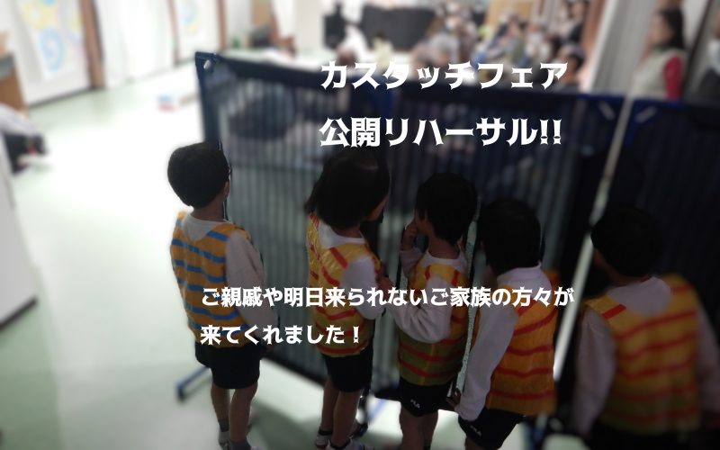 カスタッチフェアの本番は明日!今日は公開リハーサルです。おじいちゃんやおばあちゃん、また、明日来られないご家族の方々をご招待しました。こんなにたくさんの大人のお客様が入って演じるのは初めてです。今日の日が緊張で前日から緊張と喜びでドキドキしていた子がたくさんいました。でも、みんな舞台に出ることができました。緊張しすぎて固まってしまう場面もありましたが、ほんの少し声をかけたりすればいつものように動き出し、大きな成長を感じます♪終わってから、子どもたちと来てくださった皆様と触れ合いタイムを設けました、グランドで写真を撮ったり、一緒に遊んだり、とても温かい雰囲気の時間でした(*^▽^*) さて、明日が本番!!! めいっぱい楽しもうね!