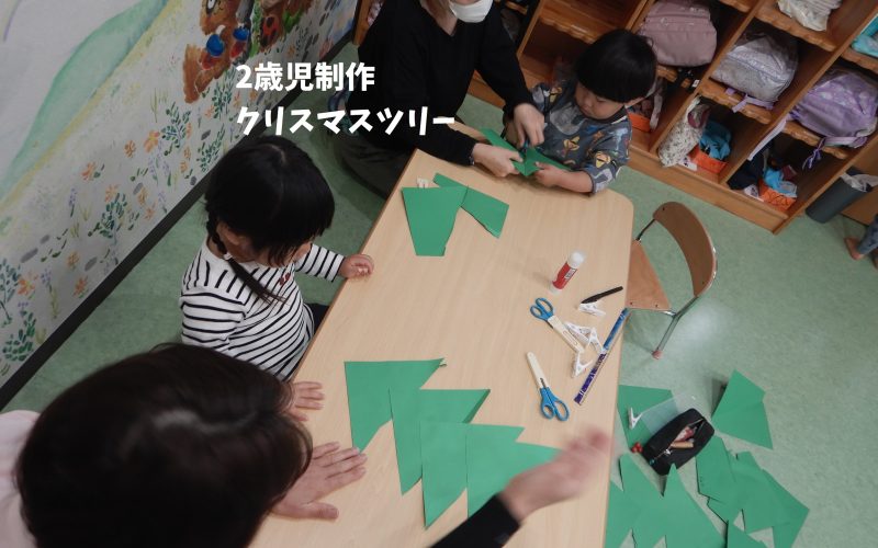 2歳児クラスはクリスマスツリーの制作☆彡 ハサミを使います。今までは1回切り(1発切り)でしたが、今日は長めの画用紙でちょっとずつ1回切りをし、連続切りの感覚に近づけるようチャレンジです♪楽しみに待っているクリスマスの装飾なので子どもたちも気分ノリノリです。「サンタさんが見てくれるよ~~!」で目の輝きが変わります🎅