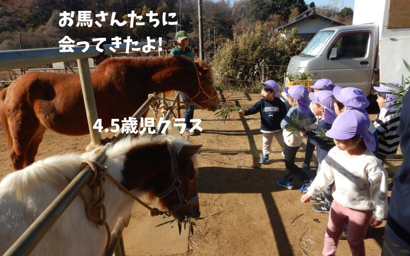 4.5歳児がしゃべりっちょ牧場まで見学に行ってきました!昨年度まで子どもたちが仲良くさてもらっていたお馬さんたちが歓迎してくれました。「しゃべりっちょ牧場」の皆様、ありがとうございました!ドキドキ、ワクワク♥近くで馬たちを見ることができて、子どもたちは保育園に帰ってくると嬉しそうに牧場のこと馬たちのことを話してくれました。この体験は子どもたちの心にキラキラな思い出としてぎゅっと刻み込まれたことと思います。