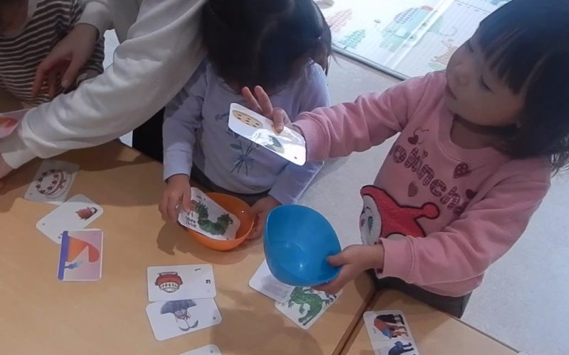 1歳児クラス。みんなが大好きな絵本のページや絵を小さなカードにして、自分だけのお気に入り絵本を作りました。好きな絵を選んでリングに留めます。自分で模様を描いた表紙がついています。はらぺこあおむしやだるまさん、できるかなの絵本の一部や食べ物の絵、たくさんあるよ!どれが好き?中には食べ物を中心に集めたり、はらぺこあおむしを集めたりしている子もいました。これからも、乗り物ページなどを作っていく予定だそうです♪楽しみですね~~~(^-^)
