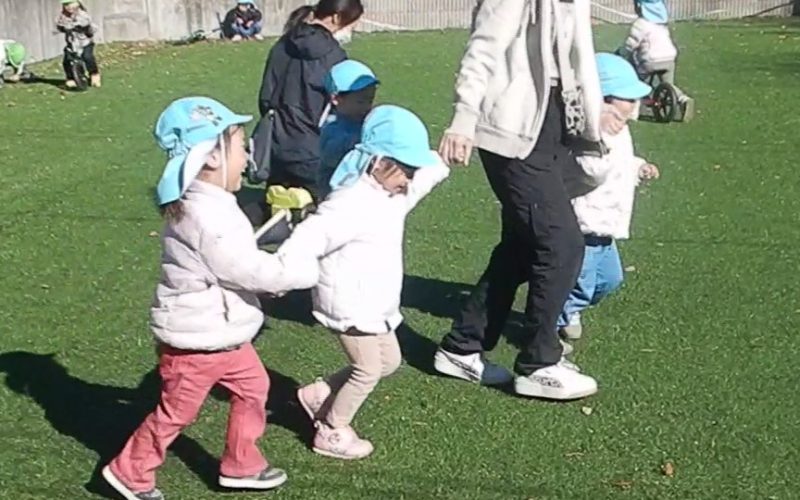 今日は朝から北風ピューピュー!でも「子どもは風が吹くと走れるから大丈夫なんだよ!」と、年長組の子が寒さなんてへっちゃら♪という頼もしい様子で教えてくれました。グランドでは2.3歳児クラスが遊んでいました。なぜか笑いながら走る子どもたち!走るって楽しいんですね!ストライダーや足蹴り自動車(乗車玩具)に乗ったり、とにかく動いていたので、風に負けずに身体はポカポカだったと思います(^_-)-☆