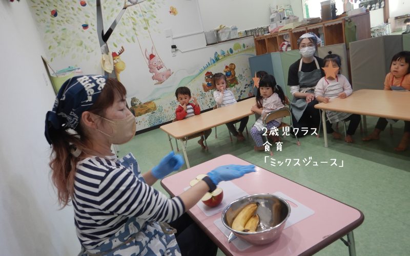 2歳児クラスの食育です。今日はミックスジュース☆☆☆ リンゴとバナナで作ります。形も色も全く違う果物です。皮の色は?切ったらどんな色?切ったらどんな形?種は入ってるかな?どんな匂い?味は?それぞれの果物を観察してから、ミキサーにかけます。(100%のリンゴジュースも追加投入!)2種類の果物が混ざるとどんな色?匂いは?味は? みんなで味わってみよう~~~\(^o^)/