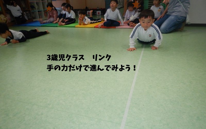 3歳児クラス リンク(カスタッチオリジナルのコーディネーション運動)です。4、5歳児でもリンクgは続いていきます。3歳児クラスでは運動を習慣にして楽しみ、進級に向けて基礎的な身体の使い方(リズムやバランスなど)を身体で覚えていきます。転んだ時にも咄嗟に手をついて身体をカバーできるようになるにも、普段の遊びがとっても大切です。 失敗しても大丈夫!自分で考えて動いてみよう!挑戦してみよう!…という気持ちも育てていきます。今日は、ハイハイ競争を始め、腹筋や腕の力を使うような運動遊びを行いました♪