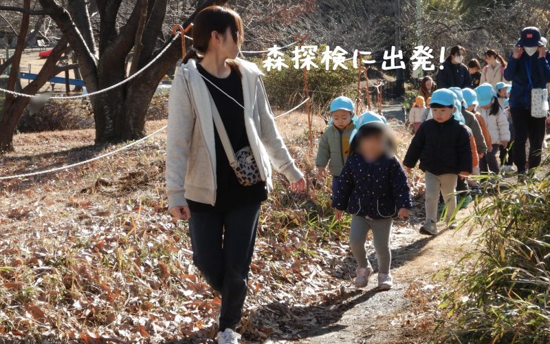 2歳児クラス、森の探検に行ってきます!! 歩くのは自然の小径♪ 枯れ葉が溜まっていたり、坂や凸凹だったり、鳥がいたり、木の枝が落ちていたり。。。発見がたくさん(^-^) 枯れ葉の下で霜柱が溶けた後の土の地面が、ふわふわで、あちこち歩き回ってその感触を楽しんでいました。