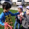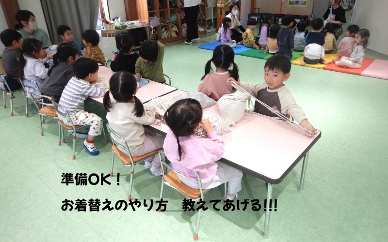4月から幼児クラスに進級するよつば組(2歳児クラス)に、1つ上クラスれんげ組がお着替えのやり方を教えてくれました。着替えを自分で出して机に置く、お着替え袋から新しい服を机の上に出し袋は床に置く。上の服を脱いだら袋の上に置き新しい服を着る!(ここでポイント!全部脱がないで、上を脱いだら上を着る、という順番で何も着ていない状態にならないように…)子どもたちが「全部脱いじゃったら、着替えている途中で地震とかあったら大変だから!」と説明してくれました。着替えた服は畳んでお着替え袋に入れて自分でリュックにしまいリュックのチャックもしめる! さぁ、よつば組も進級に向けてチャレンジしてみよう!できなくても大丈夫(^_-)-☆今のれんげ組も最初はできないこともあったから♫ 先に着替えが終わったれんげ組はよつば組の手伝いに奮闘していました。頼もしくなったねぇ~、と感じる一コマでした。