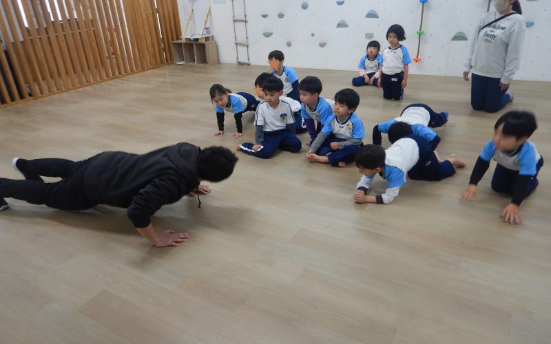 4歳児クラスの活動「リンク」 その中で腕立て伏せにチャレンジ!身体を全部持ち上げるのがつらい人は、膝つき腕立て伏せからスタート!お腹を下げない、肘を曲げる、床についた腕は顔より前にならないように…まず腕立て伏せのポーズが難しい★腕の力はもちろん腹筋、背筋を使わないとお腹が下がってしまいます。正しいポーズのコツをを身体でしっかり覚えてから始めます。 最近の子どもたちが腕の力が弱い、転んだ時に手をついても支えられず顔から突っ込んでしまい大けがになる、小学生でもケガをしている・・・近年特に目立ってきている問題に目を向け、リンクでも腕立て伏せを取り入れていました。自然のでこぼこ道を歩いたり、山の斜面を這って昇り降りしたり、木などにぶら下がったりして遊ぶ機会が減ってきていることもあると思います。自分の身を守るために必要な運動など意識して日常の遊びの中にも取り入れていきたいと思います。 ぜひ、ご家庭でも一緒にやってみてください♫