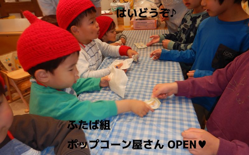 カスタッチプラザ最終日は…1歳児クラスのポップコーン屋さんです。「いらっしゃいませーーーー」って練習している姿も可愛かったです(^-^) さぁ、お客さんが来ますよ♪カスタッチ銀行のお金と引き換えに「はい、どーぞ!」って渡せるかな? 昨日のお買い物でおにいちゃん、おねえちゃんのお店屋さん姿を見ているから、上手に真似っこできました。かわいい店員さんありがとう♪