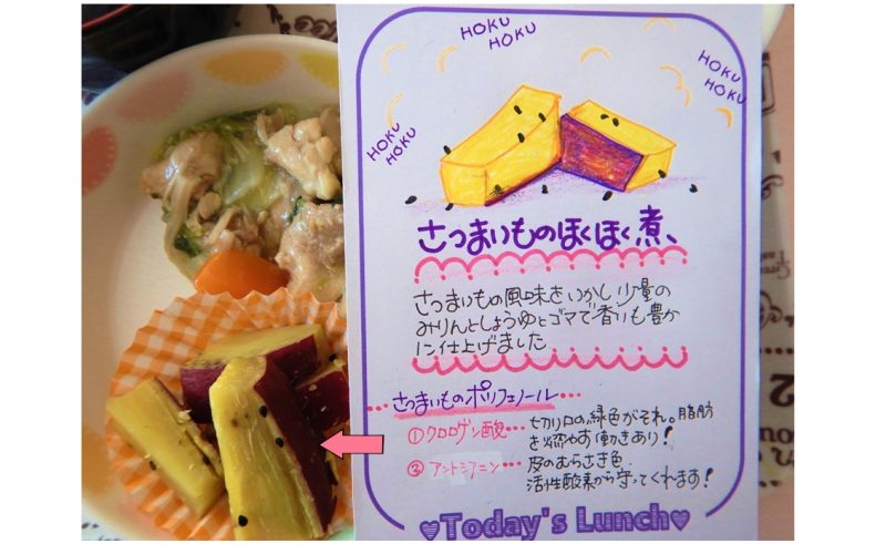 さつま芋!!今日のさつま芋はホクホク種(^-^) 自然な甘みが少量のみりんとしょう油と黒ゴマで際立ちます。さつま芋には身体に良い効果がたくさん!太る!!!・・・と思われがちですが、いえいえ!腸の動きを活発にする成分(ヤラピン)や、食物繊維(デトックス!)、ポリフェノール(脂肪の燃焼効果あり♥)、またビタミン類なども豊富に含まれます。ほかの食品同様、美味しくて止まらない~と過度な食べ過ぎはもちろん禁物ですが(^^; 成人も積極的にたべたい食材です♪