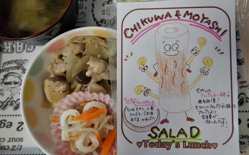 もやし、人参とちくわのうま味、塩味、甘味が合わさって、薄味でも美味しいサラダです。味付けにはトリガラとごま油、白ゴマを使っていますが、かれぶしも入っているのがポイント!中華風というよりも、お口の中は和風な味わい♪発酵食品のかれぶしの香りがよく効いています!