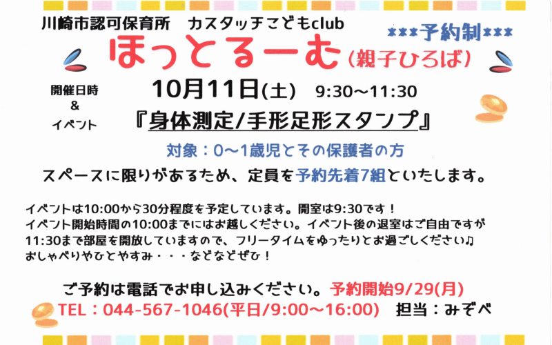 10/11㈯は手形足形スタンプと身体測定(助産師在室)を行います♪
