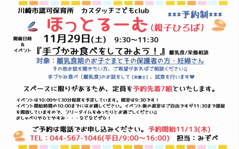 11/29㈯のイベントは「手づかみ食べをしてみよう!」栄養士からのお話です。