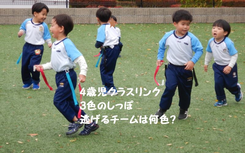 空気も冷えてきましたが、たくさん走って運動するにはちょうどいいくらいの陽気でした!4歳児クラスはカスタッチオリジナルのコーディネーション運動『リンク』 準備運動で身体を温めたら、今日のメニューへ★ 合図を聞いて素早く動きに変換する!! うまくできなくても大丈夫(^_-)-☆ 何度も繰り返すうちに運動神経系が刺激を受け、「スムーズに運動できる身体」に繋がっていきます。さて、今日のメニューは?腰の両脇につけた2本のしっぽ。3チーム(3色)に分かれてしっぽ取りを行います。しっぽを狙われるチームは、声かけで知らせます。コールがかかった色のチームは狙われます、、、なので逃げる!それ以外のチームはしっぽを取りに追いかけるのですが、狙われるチームは途中で変わるので、急に追いかけられる立場になるかもしれません!自分でしっかり合図を聞いて、ゲームスタートです\(^o^)/