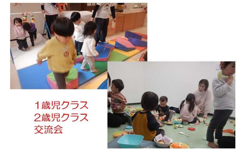 よつば組(2歳児クラス)とふたば組(1歳児クラス)の交流会です♪ おままごとコーナーと運動遊びコーナー、それぞれの部屋をセットしました。よつば&ふたばの混合で2グループに分けて、それぞれのコーナーで遊びます。時間がきたら入れ替えます。1学年しか違いませんが、よつば組の子が「どうぞ」と優しく接する姿があったり、ふたば組がよつば組の真似をして運動しようとする姿があったり・・・互いに刺激を受け合いながら楽しんでいました(^_-)-☆